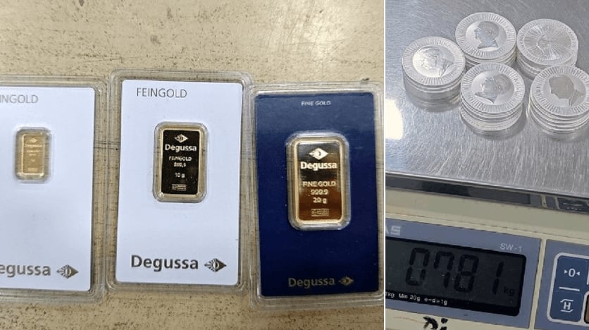 Im Rahmen einer detaillierten Durchsuchung eines ausreisenden Fahrzeugs entdeckten Beamte der Abteilung zur Bekämpfung des Schmuggels der Zollverwaltung zwischen Kleidungsstücken eine versteckte Kunststoffbox. Darin befanden sich drei Goldbarren der Marke „Degussa“ mit einem Reinheitsgrad von 999,9 sowie 25 australische Silbermünzen mit den Abbildungen von „Charles III“ und „Elizabeth II“.